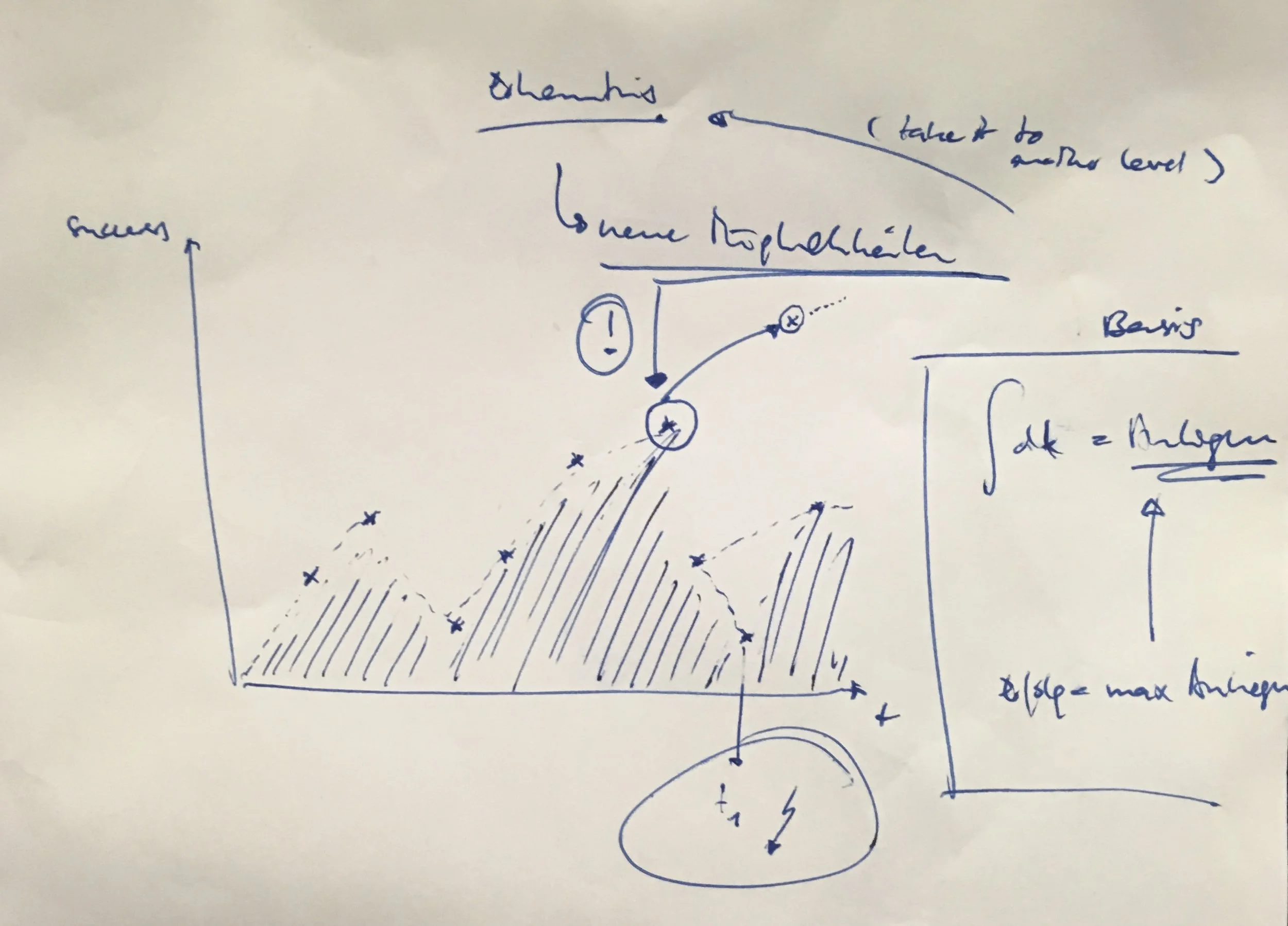 Ich befahl mein Pferd aus dem Stall zu holen. Der Diener verstand mich nicht. Ich ging selbst in den Stall, sattelte mein Pferd und bestieg es. In der Ferne hörte ich eine Trompete blasen, ich fragte ihn, was das bedeutete. Er wusste nichts und hatte nichts gehört. Beim Tore hielt er mich auf und fragte: „Wohin reitet der Herr?" „Ich weiß es nicht", sagte ich, „nur weg von hier, nur weg von hier. Immerfort weg von hier, nur so kann ich mein Ziel erreichen." „Du kennst also dein Ziel", fragte er. „Ja", antwortete ich, „ich sagte es doch: ‚Weg-von-hier' - das ist mein Ziel." „Du hast keinen Eßvorrat mit", sagte er. „Ich brauche keinen", sagte ich, „die Reise ist so lang, daß ich verhungern muß, wenn ich auf dem Weg nichts bekomme. Kein Eßvorrat kann mich retten. Es ist ja zum Glück eine wahrhaft ungeheure Reise." (Kafka)